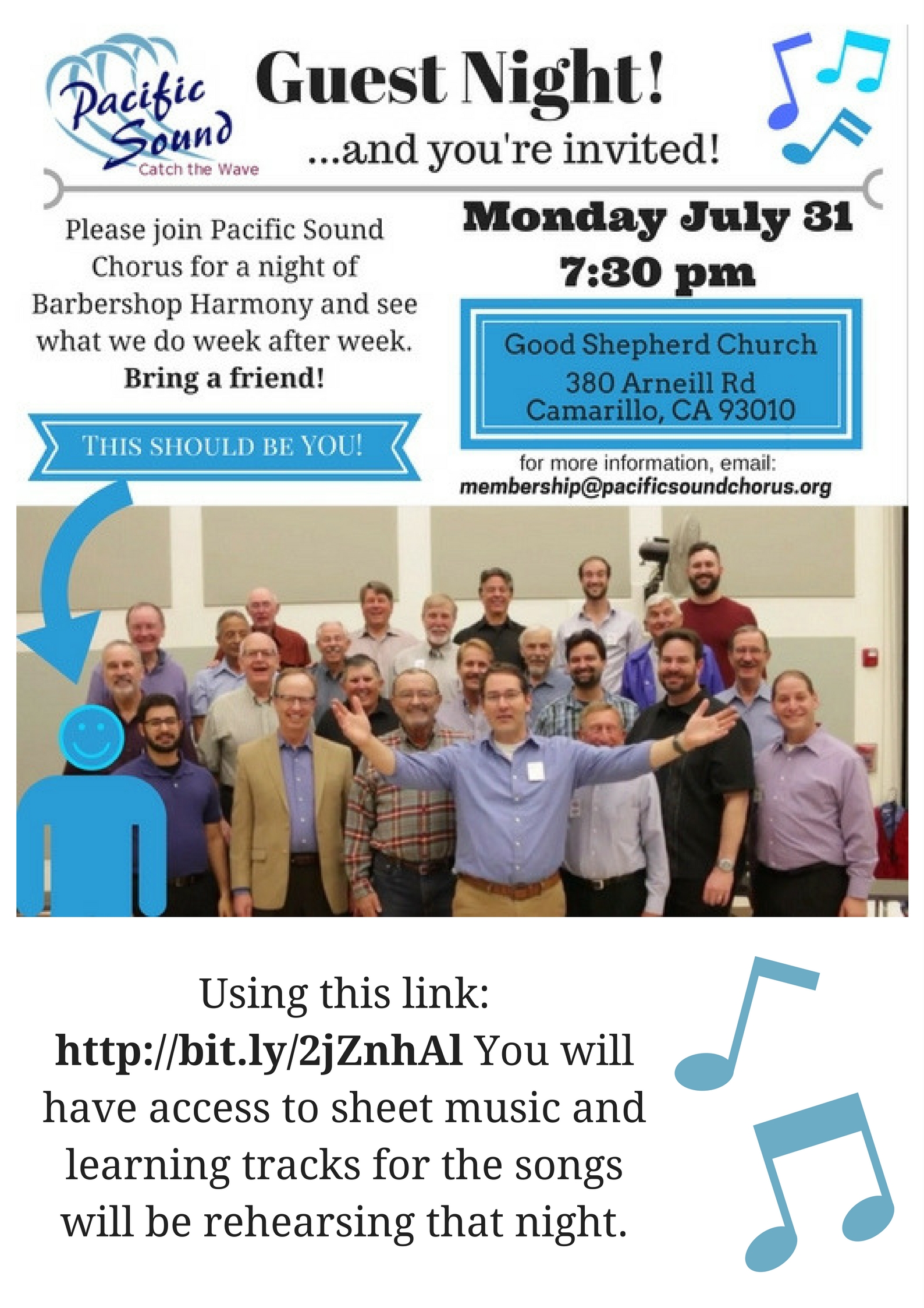 Come visit Pacific Sound Chorus on Monday October 24th at 7:30PM to experience what it is like to sing 4 part harmony! Many of our members can attest to the fact that it only takes 1 time to be hooked. Bring a friend as well! We don't want to keep this experience a secret from any men that want to SING! If you plan on coming, please drop a line to membership@pacificsoundchorus.org or call us at 805-312-6439. We hope to see you there! Attachment: